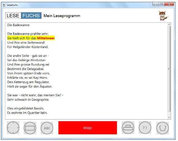 Das Buchstabierungstool wurde für den unerfahrenen Leser entwickelt. Hierbei wird nicht nur jedes Wort einzeln in ein separates Textfeld projiziert, sondern überdies noch Buchstabe für Buchstabe aufgebaut. Des Weitern kann die Methodik im Rahmen des Volltextmodus auf den ganzen Text angewendet werden, so dass sich ein Gefühl für dessen Gefüge entwickeln kann.