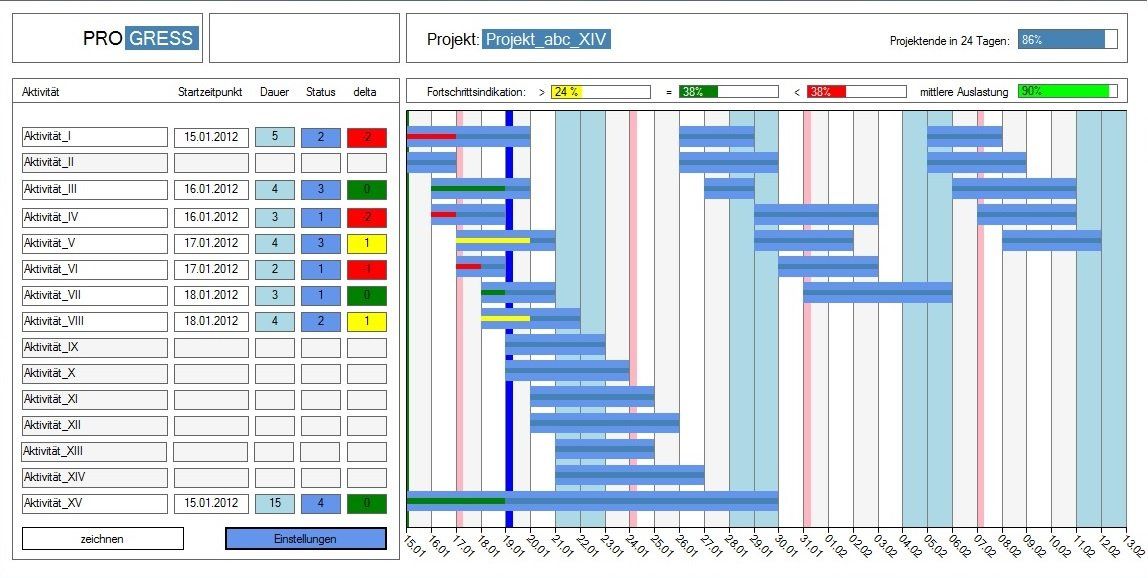 Das Alleinstellungsmerkmal von Progress wird erst nach diesem Prozedurschritt ersichtlich. Die Software präsentiert mit Hilfe einer ausgeklügelten Abfrageroutine nämlich nur Aktivitäten, die im Rahmen des aktuellen Zeithorizonts von Interesse sind. Diese werden optisch hervorgehoben und in einem übersichtlichen Listenmodul dargestellt. Die Komplementärmege hingegen wird ausgegraut, so dass sich der Projektmanager auf das Wesentliche konzentrieren kann. Die tabellarische Aufstellung findet ihre grafische Ergänzung in einem Ganttchart, der Multicolor-Balken generieren kann. Aufgrund der innovativen Präsentationsform können alle relevanten Projektmerkmale schnell und nachhaltig wahrgenommen werden.
